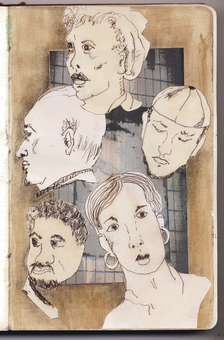 When New York City was home, I did a lot of drawing around the city as well and whenever I could get a seat on the subway, I would try to subtly draw the faces around me. I drew on Post-It Notes, sketchbooks, receipts... If one person left, I would just combine the face with the next one that came along. This is a collage of a couple of those quick sketches. There is also a graphite sketch... It was a delayed train, and the two people are real.