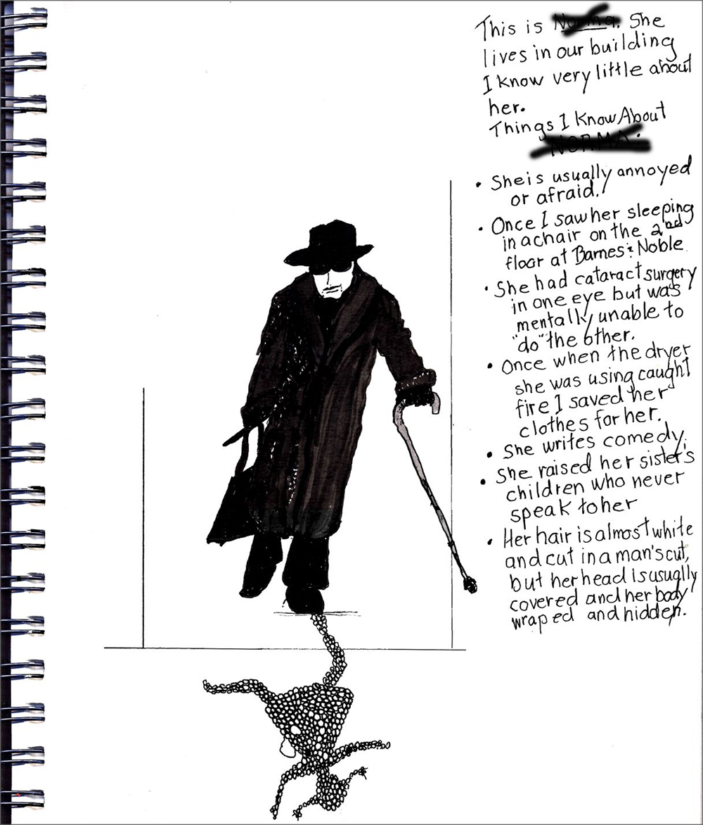 The drawing of the woman in the black coat is a lady I saw almost every day in our building and around the neighborhood. The notes on the sketch are about how little I knew of her in spite of the ten years we were acquainted. She was almost no more than a shadow passing on the street... a street full of many passing shadows.
