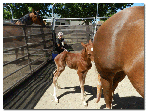 Leroy meets the sunny, outdoors part of his birthing stall at Diamond-K Ranch in Brentwood, CA. Owners Mike and Kate (grandparents) and in-laws Bernie and Peg (great-grandparents) are all there. Sally (the Mom) is getting used to having him there. - Leroy - Day 2