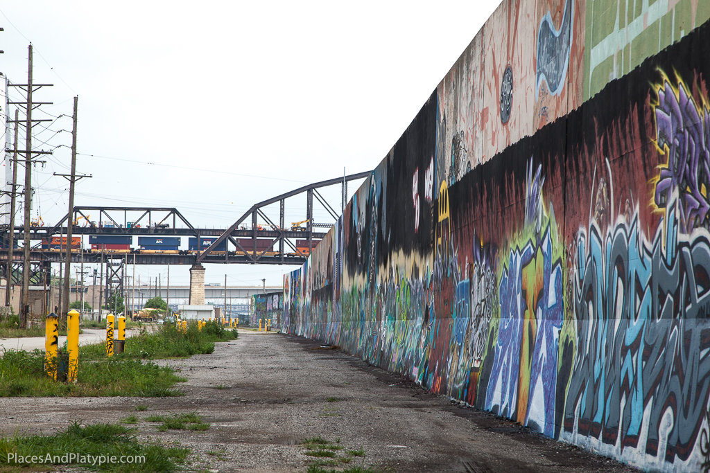 Looking north along the flood walls south of the Arch.